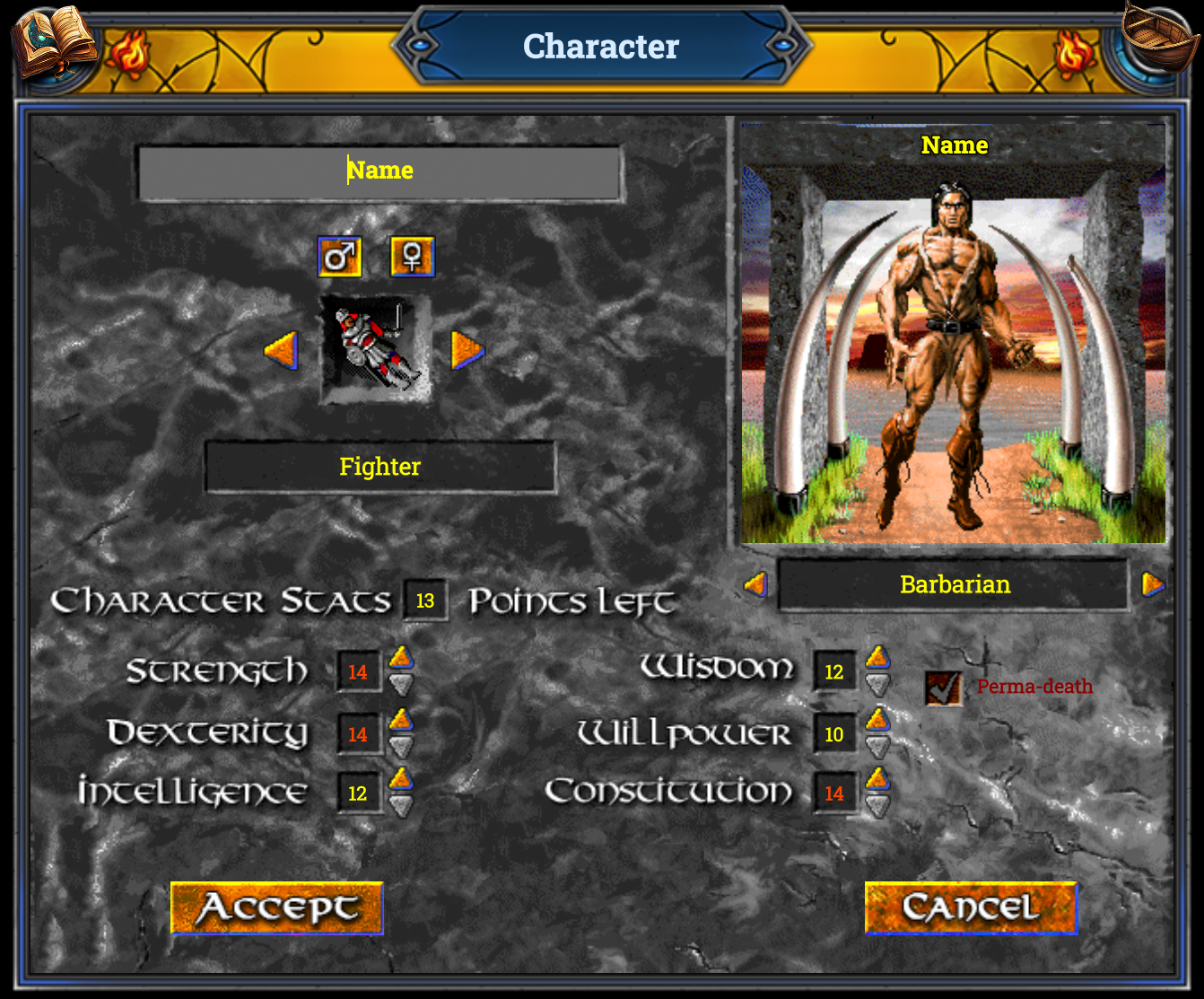 This screen should be fairly intuitive. Just change your name in the textbox at the top left. Change your gender, class, and race (image to the right) to whatever is desired using the buttons and arrows. Use the available stat points to increase your stats. Ultimately where you put your stat points is unimportant as stats can be increased through stat potions or in the case of fighter's strength, a quest. Race is ultimately even more unimportant in terms of your character stats. Race affects your start skills slightly, but the difference is so insignificant you will out level that difference within your first 10 minutes of game play. Consequently, race is ultimately purely cosmetic. While stats can be increased later in the game, you will likely be stuck with your starting stats for a while, and they heavily affect HP/Stamina/MP. So, see Creating your Character for more information on each class and the stats important to them. Choose whether the character will be perma-death or not and hit accept. This will take you back out to the conference room (shown below)