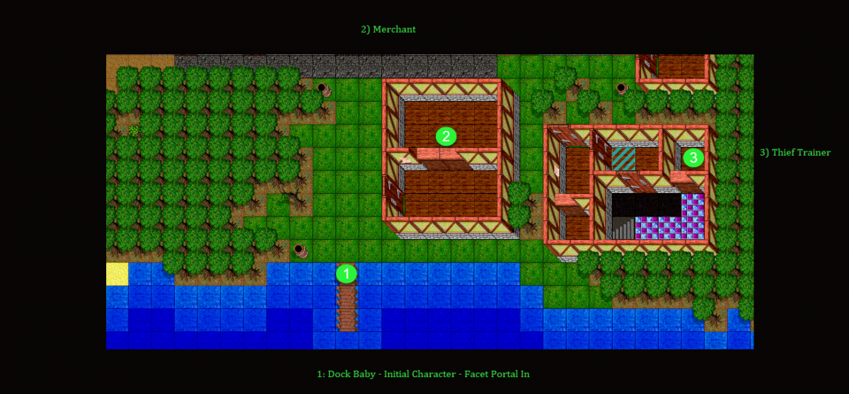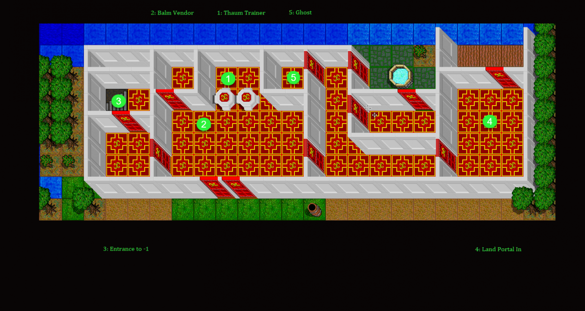The dwellings of the local peasants are East of the Main Street, at the other end of the Street of Thieves. They are too busy trying to provide themselves with food and shelter to take much notice of the random adventurers who come to the island. The plaza on this street holds an active market on most days. The town Wizard has his lowly abode just to the North of the plaza, off the alley. A humble sage has been living just East of the plaza for some years. The Thieves' Guild is headquartered on the South side of the plaza. A pawnshop is located just inside the entrance to their building. Around here, one can also find the seller of recall rings - handy devices which return the wearer to the spot where it was put on the instant it is removed.