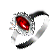 A silver ring with a fiery red ruby inset among a circle of diamonds.